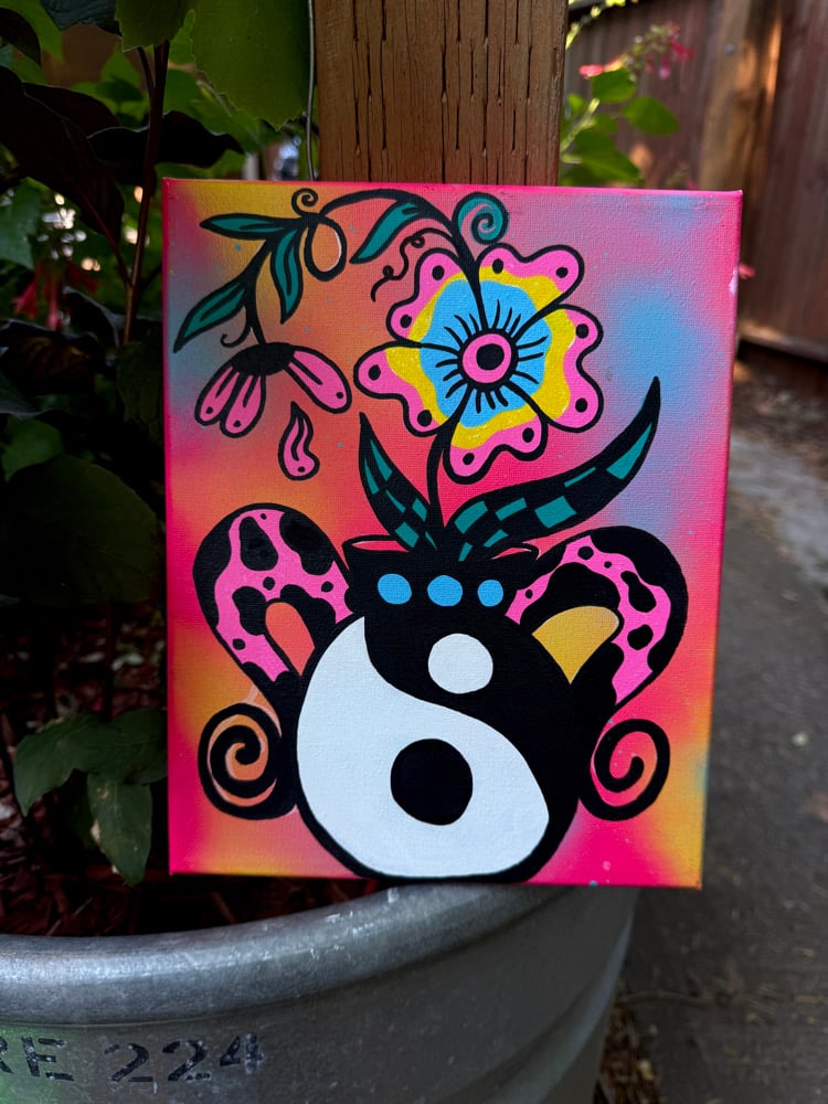 Spray paint and acrylic on canvas. Measures 8 inches width, 10 inches length.